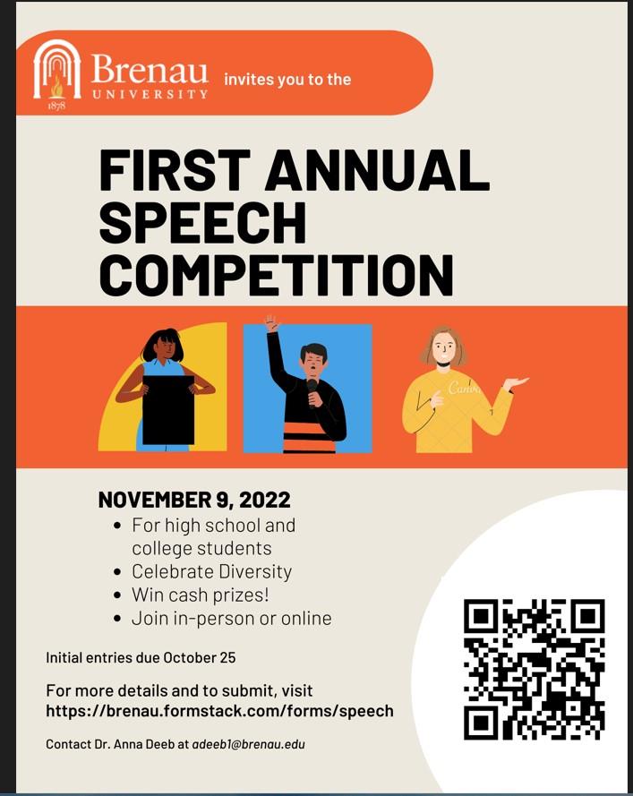 All students at the high school and college level are invited to submit. Do you have a speech that will inspire our community? Once your recording has been submitted, a panel of Brenau faculty, staff, and students will determine who will advance to the final round. Competitors in the final round will be invited to campus in-person or virtually to deliver their speeches; the best speeches in each age category will receive cash prizes and Brenau swag!